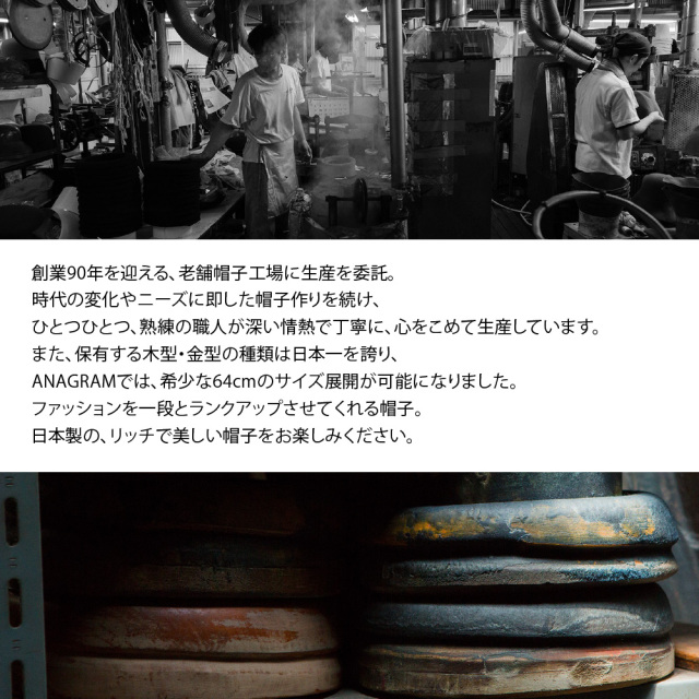 90年に及ぶ生産のノウハウを蓄積させてきた、信頼できる老舗帽子工場に生産委託し、自信を持ってオススメできるハットです。