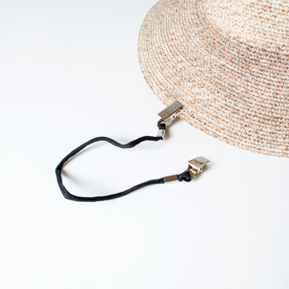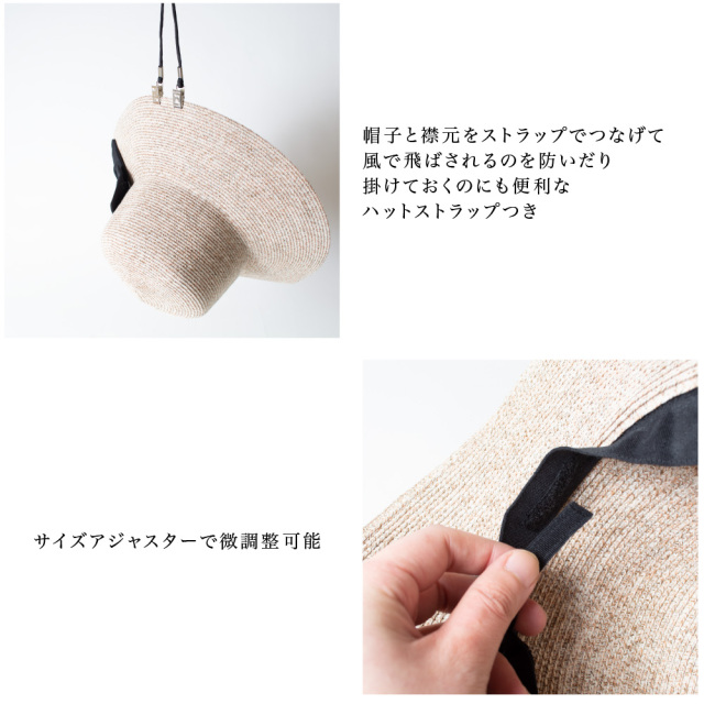 ・帽子と襟元をつなげて、風で飛ばされるのを防いだり、掛けておくのに便利なハットストラップつき