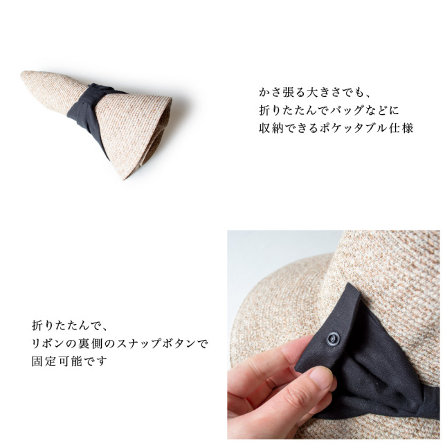 ・折りたたんで、リボンの裏側のスナップボタンで固定可能