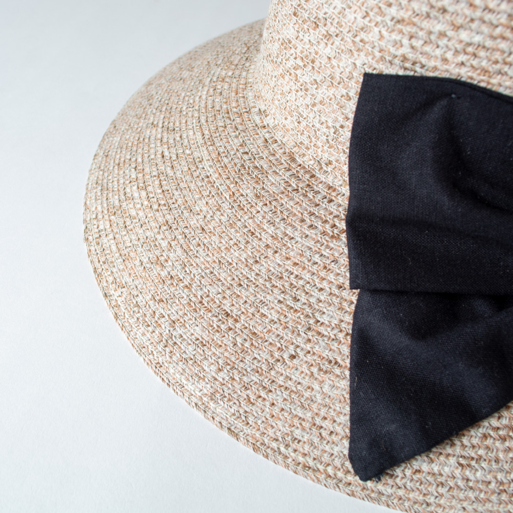 女優帽とも呼ばれるハットで、清涼感あるリネン素材の大きめのリボンがアクセントになった、女性らしいデザインです。