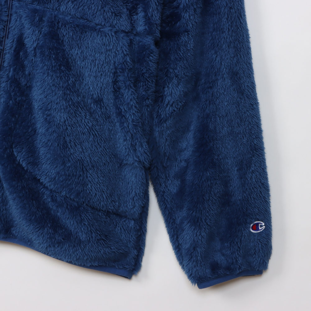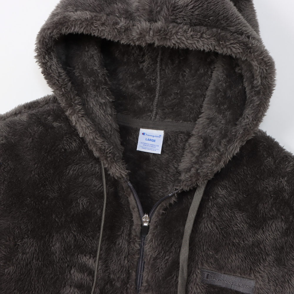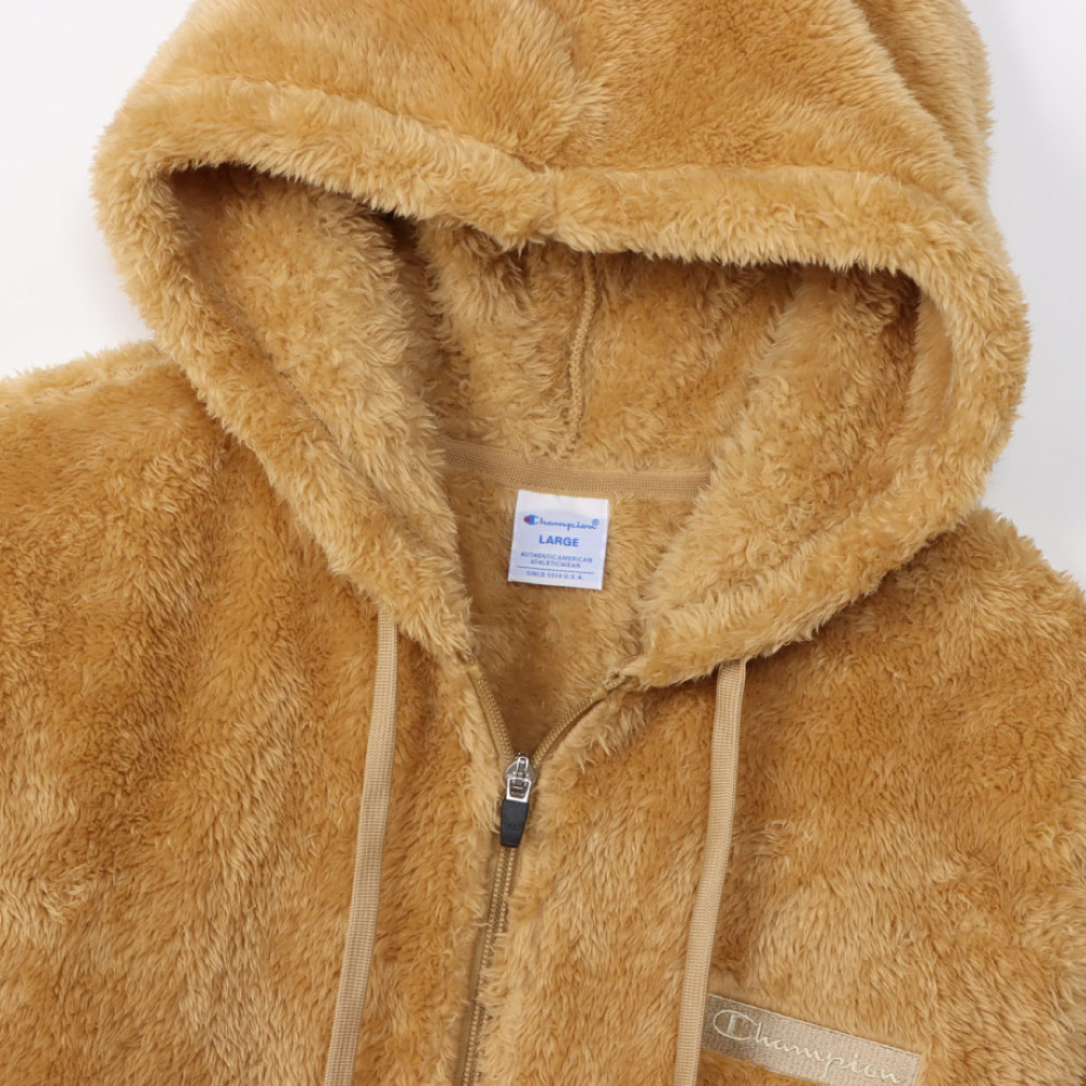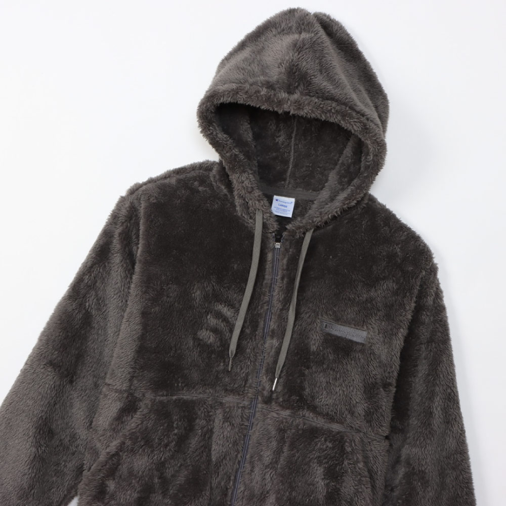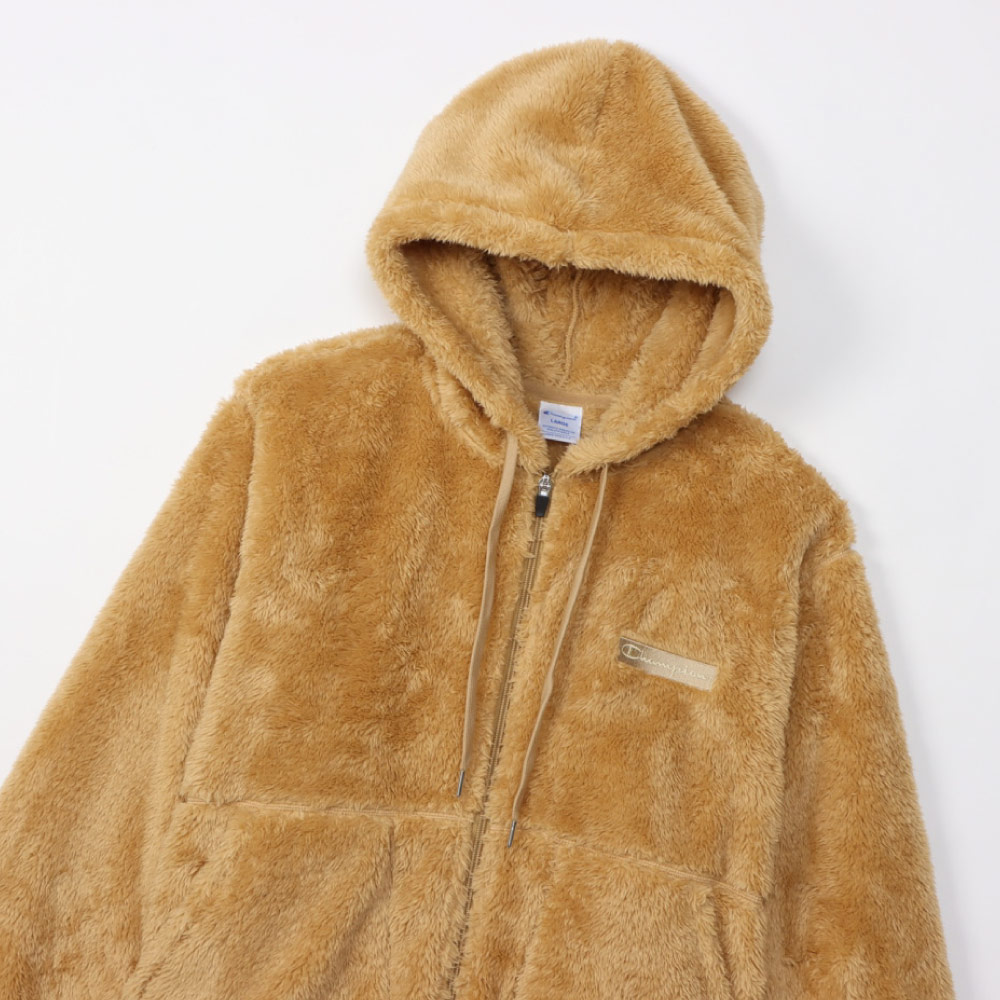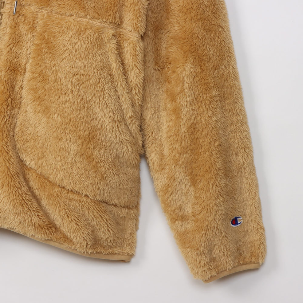 柔らかい肌触りでふわふわと毛足が長く、上品な光沢が魅力のシェルパフリース素材のジップフーデッドジャケットです。