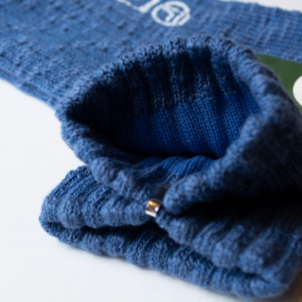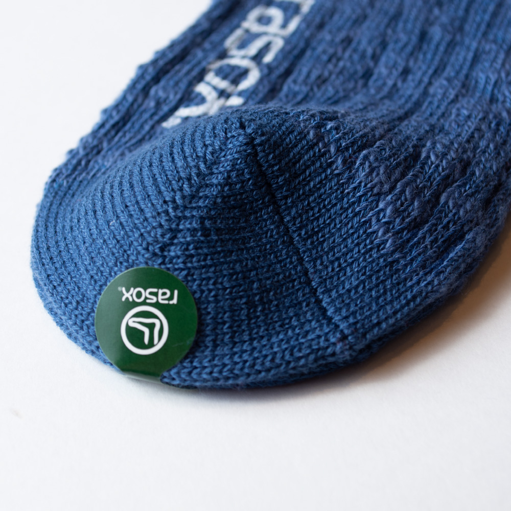 時間をかけて染め上げた表情豊かな太いスラブ糸でリブソックスを編み立てました。