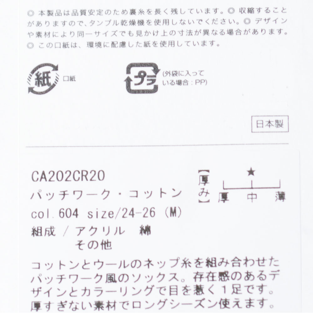 製品名: 靴下 ソックス パッチワークコットン クルー丈 レディース メンズ ユニセックス 女性用 男性用 男女兼用 日本製 CA202CR20