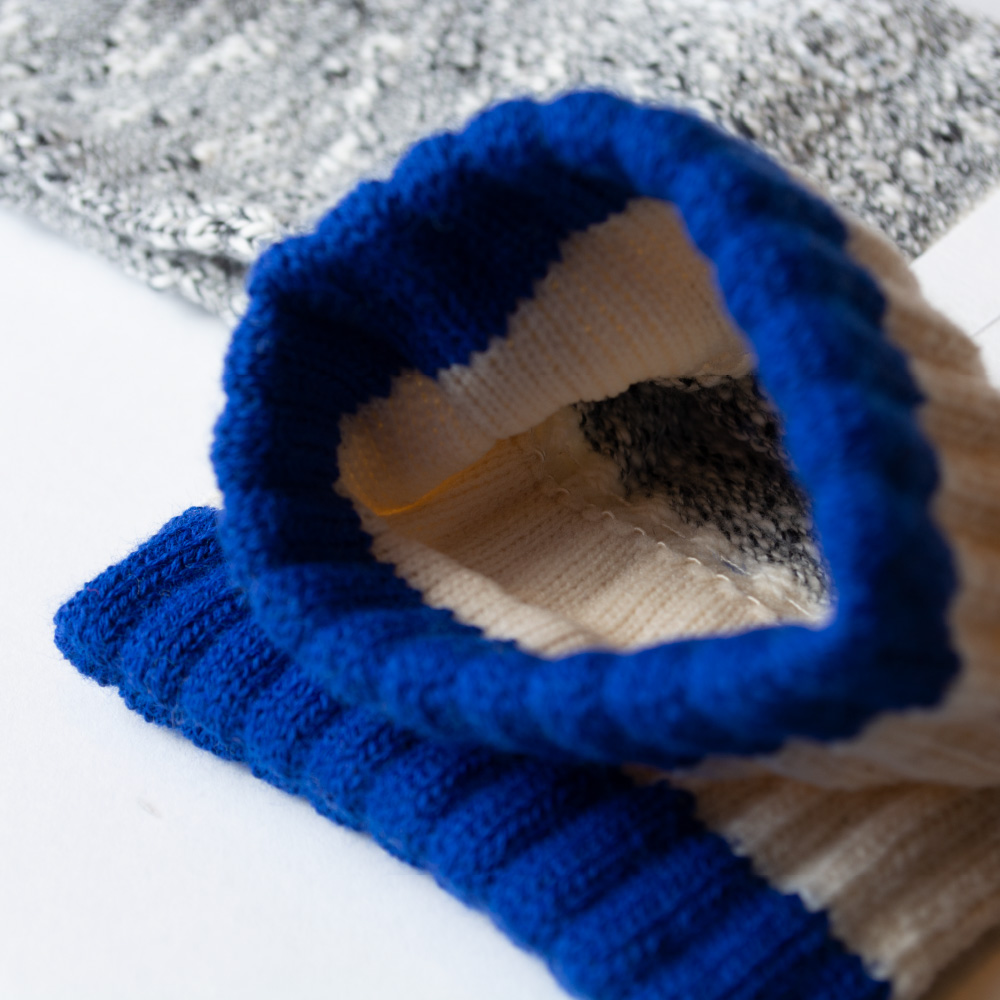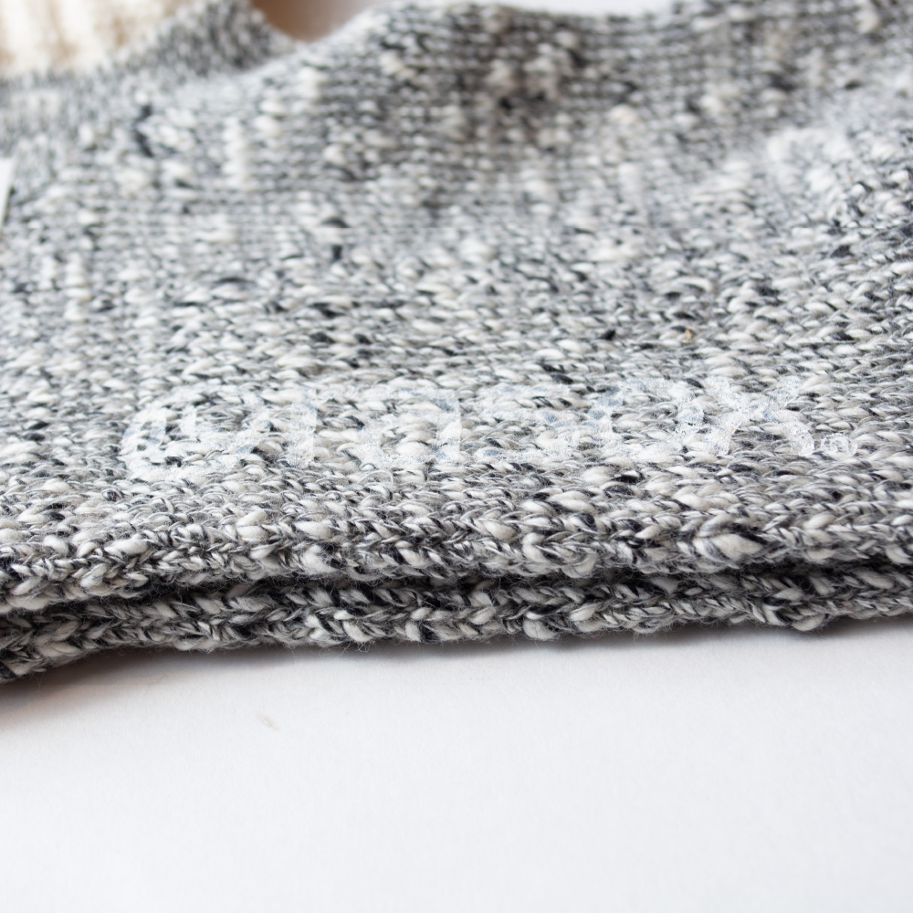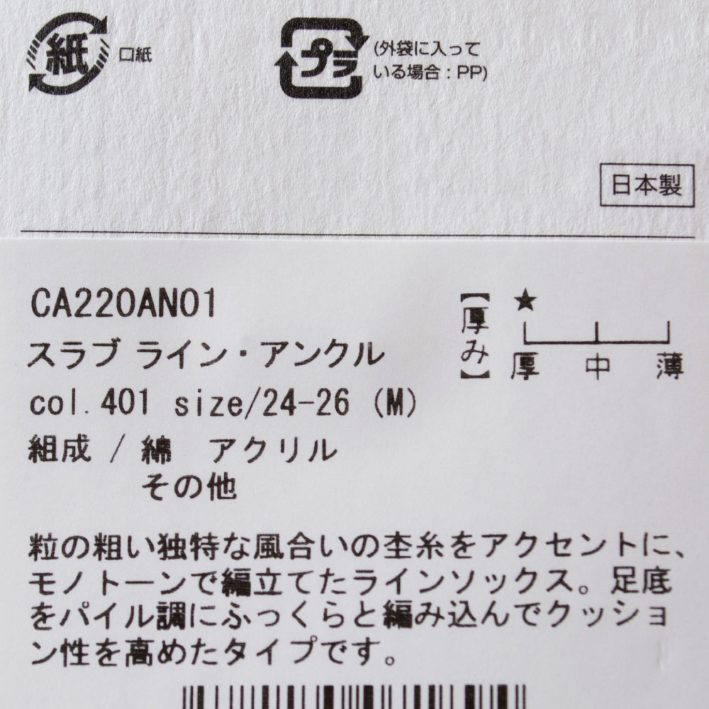 独自のカタチが、概念をかえる。独自のココチが、くせになる。粒の粗い独特な風合いの杢糸をアクセントに、モノトーンで編み立てたラインソックス。