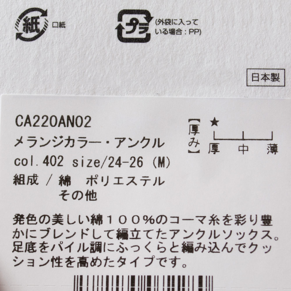 独自のカタチが、概念をかえる。独自のココチが、くせになる。発色の美しい綿100%のコーマ糸を彩り豊かにブレンドして編立てたアンクルソックス。