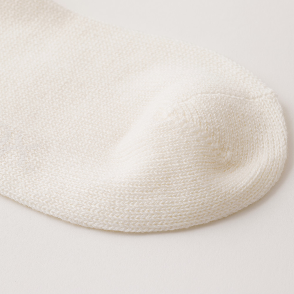 締めつけを感じにくくズレにくい、足首を直角に編みたてたL字型靴下として赤ちゃんから介護まで様々なライフシーンに心地よくフィット。