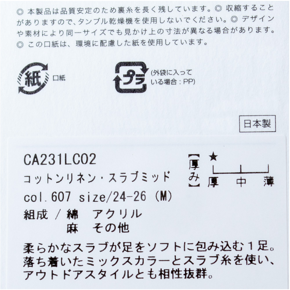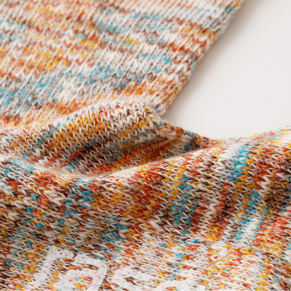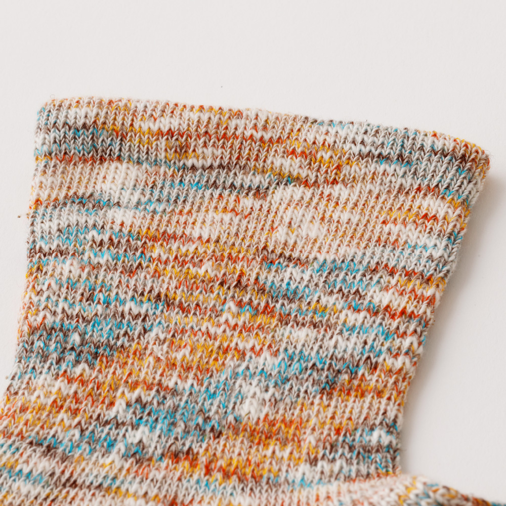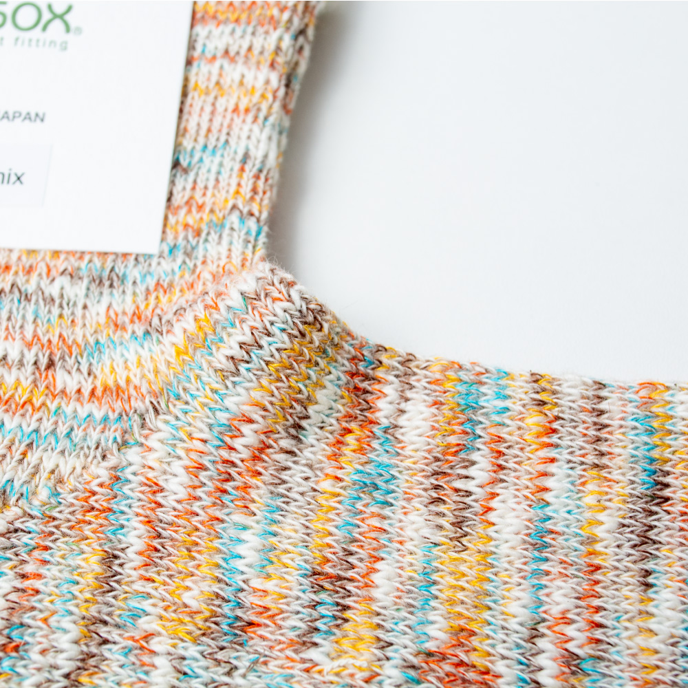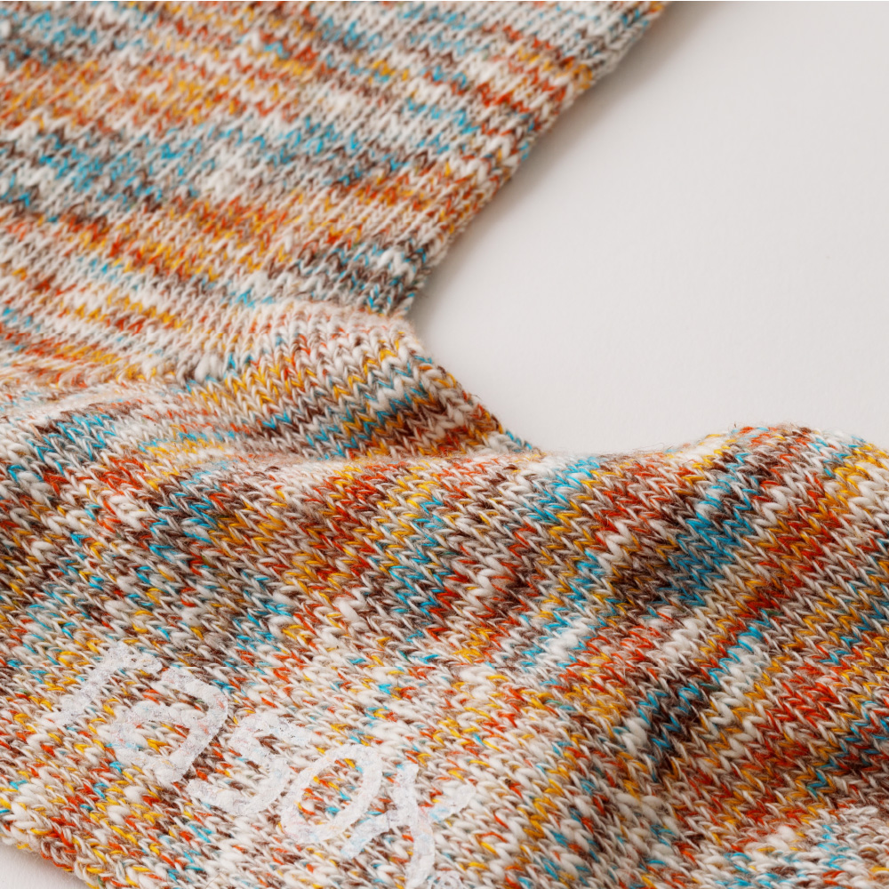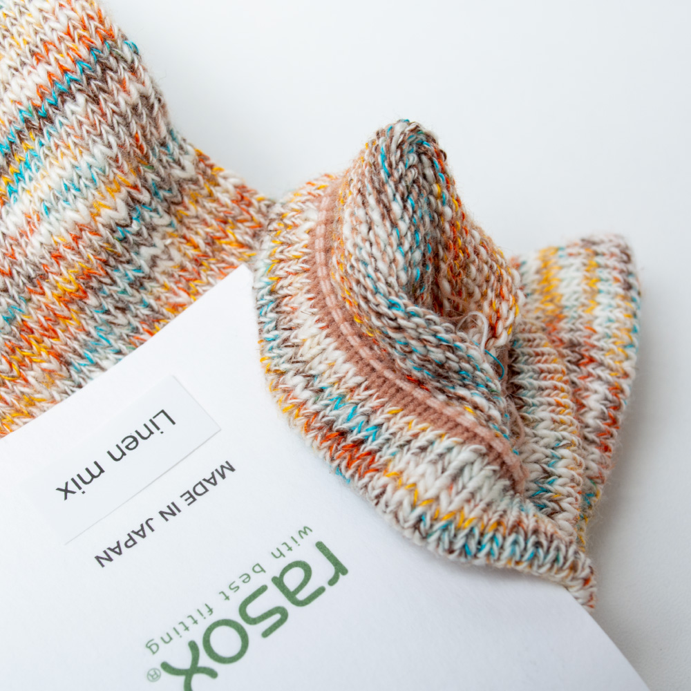 落ち着いたミックスカラーとスラブ糸を使い、やさしい足元な印象に。