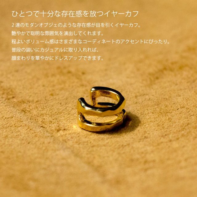 ひとつで十分な存在感を放つイヤーカフ2連のモダンオブジェのような存在感が目を引くイヤーカフ。