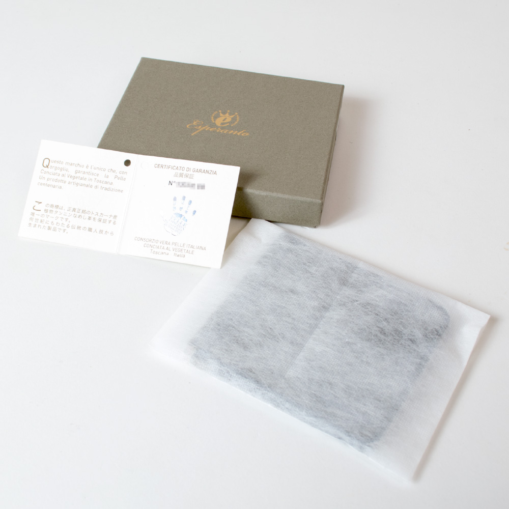 この革は、フランス産の原皮を使用し、植物から抽出されるタンニンエキスを時間をかけて原皮に浸透させ、独自の調合された牛脚油で加油する手間をかけたバケッタ製法という伝統的な技術でつくられております。