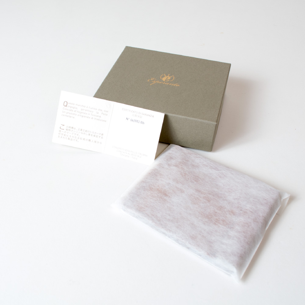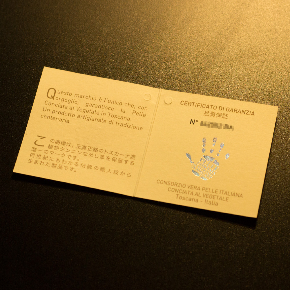 この革は、フランス産の原皮を使用し、植物から抽出されるタンニンエキスを時間をかけて原皮に浸透させ、独自の調合された牛脚油で加油する手間をかけたバケッタ製法という伝統的な技術でつくられております。